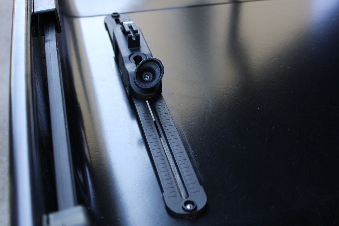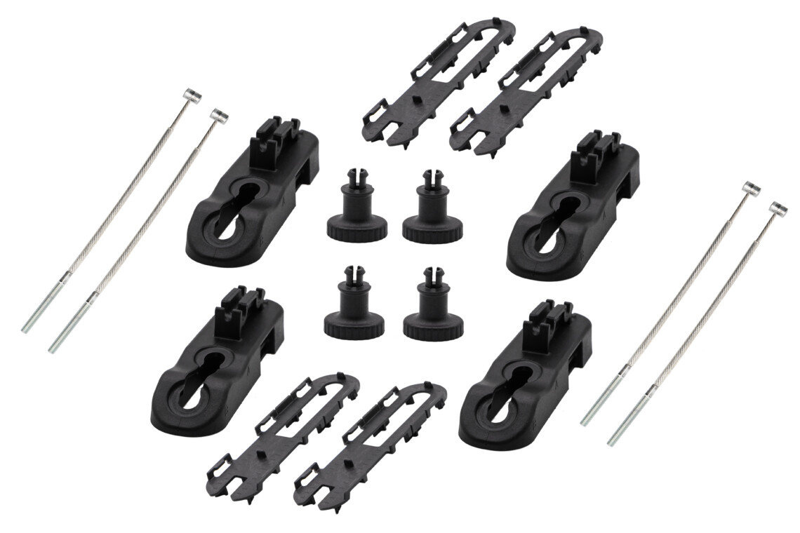 Das Montagesystem ermöglicht die Anpassung an den Abstand der Dachträgerstangen, der im Bereich von liegen sollte 62 cm runter 105 cm . Das Stahlkabel, das die Balken überspannt, ist mit einem haltbaren Material geflochten, das schützt das Grundgestell vor Kratzern.