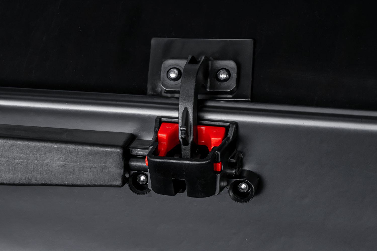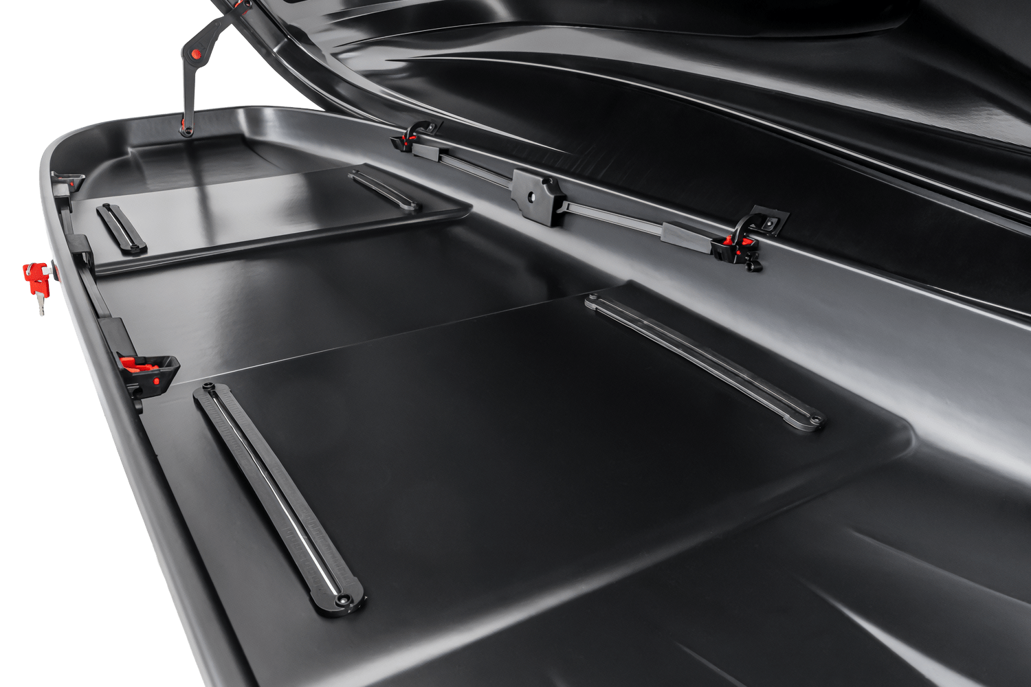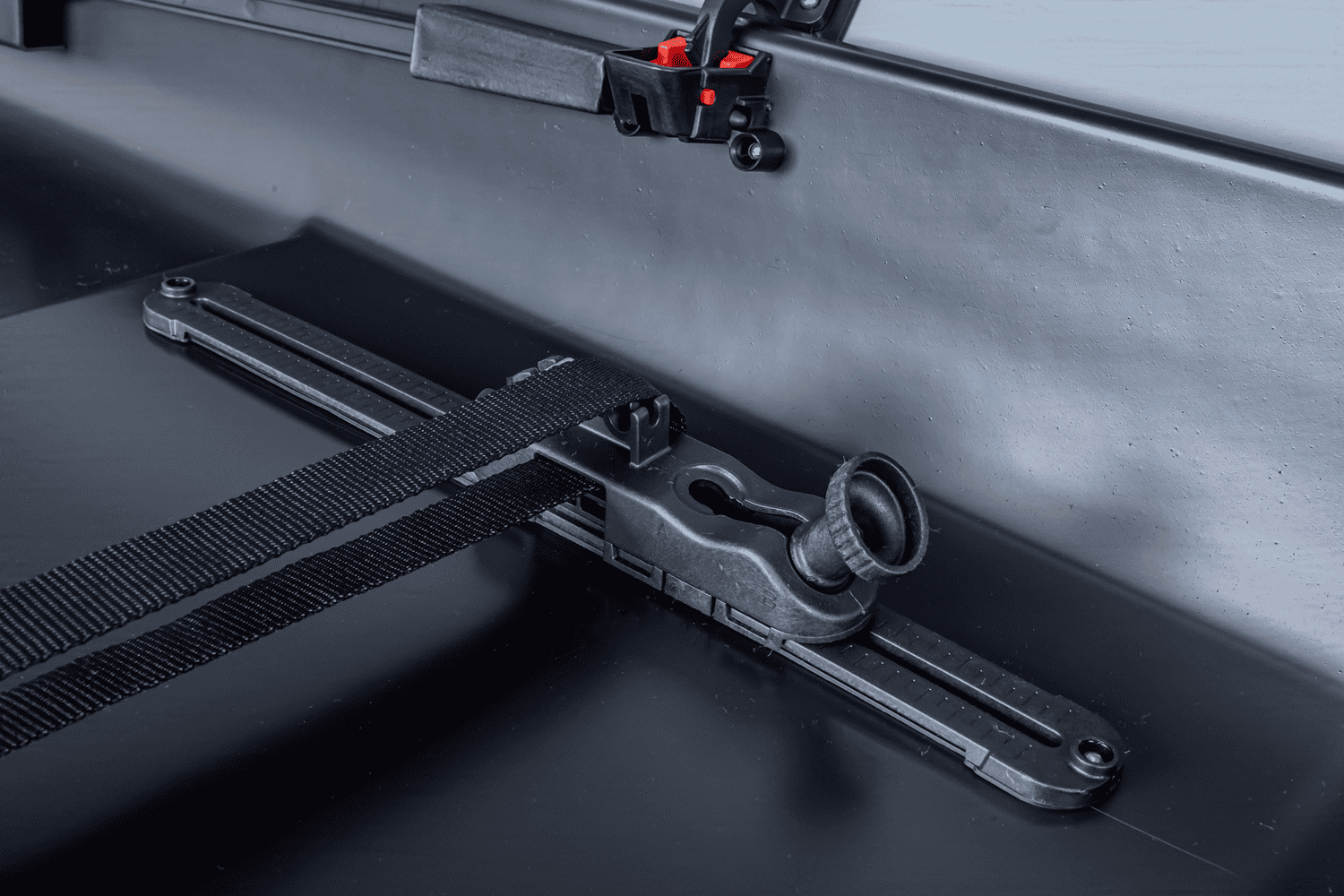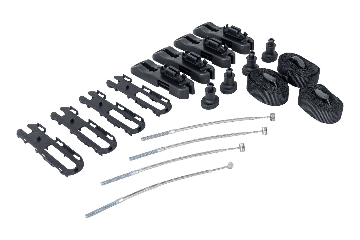 Das Set enthält außerdem Textilgurte zur Sicherung des Gepäcks während des Transports (die Box verfügt über spezielle Stellen zum Befestigen der Gurte, die in das Befestigungssystem eingebettet sind).