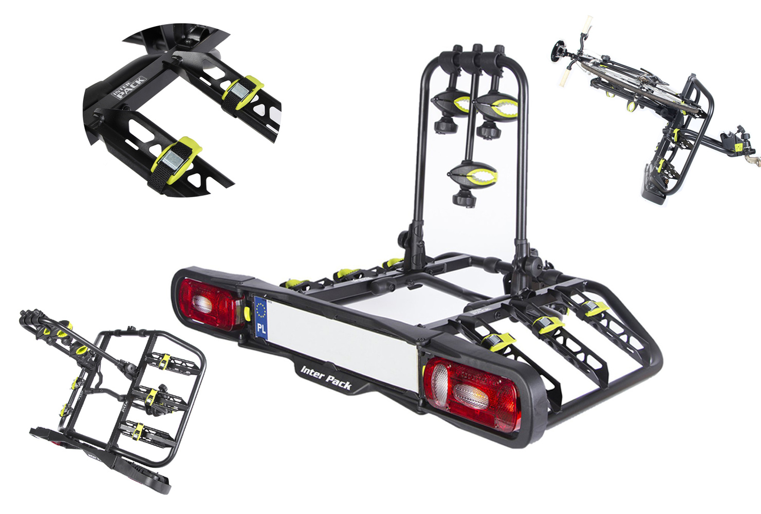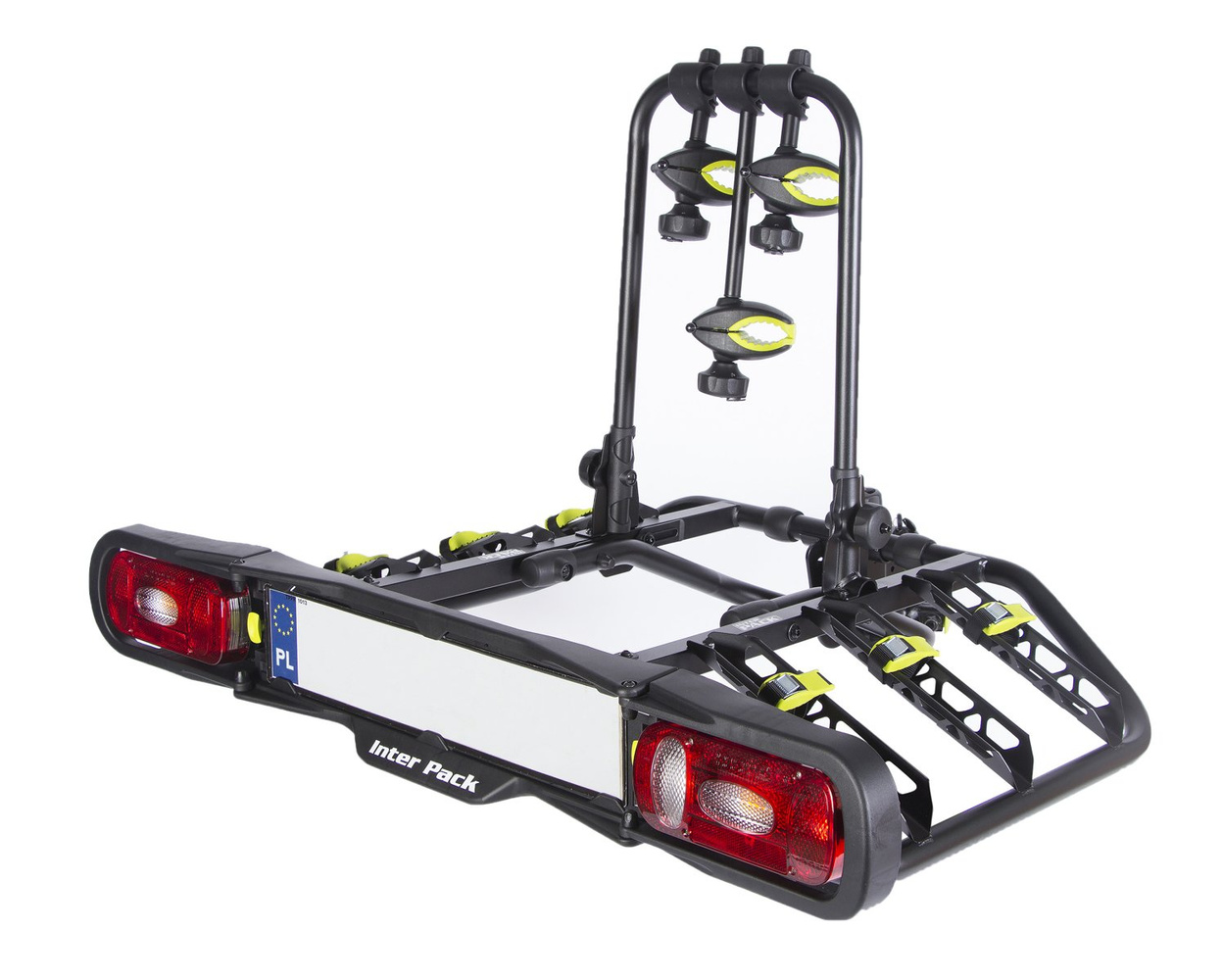 - Der Inter Pack Trio Anhängerkupplungs-Fahrradträger ist eine stabile Plattform für den Transport von drei Fahrrädern. Die Kippfunktion ermöglicht einen einfachen Zugang zum Träger, auch mit montierten Fahrrädern. Er verfügt über einen 13-poligen Stecker.