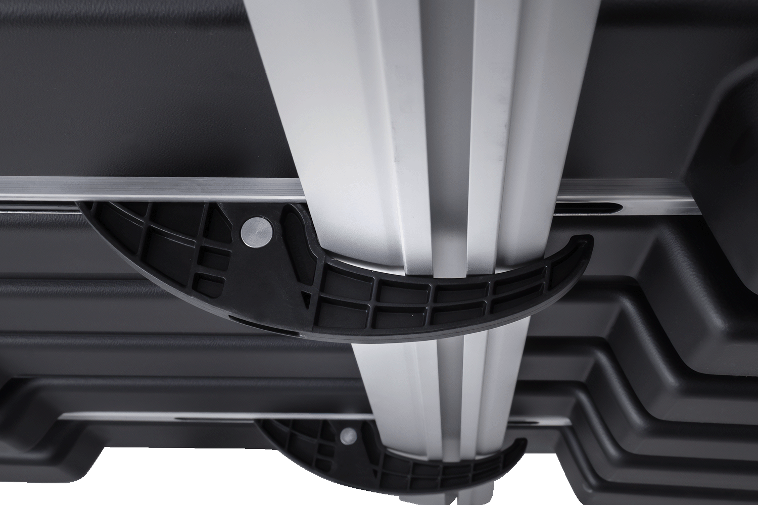 Das Rapid Fit -Montagesystem gewährleistet eine schnelle, sichere und einfache Installation der Box auf dem Dachgepäckträger. Es passt auf alle Arten von Stangen : rechteckig, oval und flügelförmig.