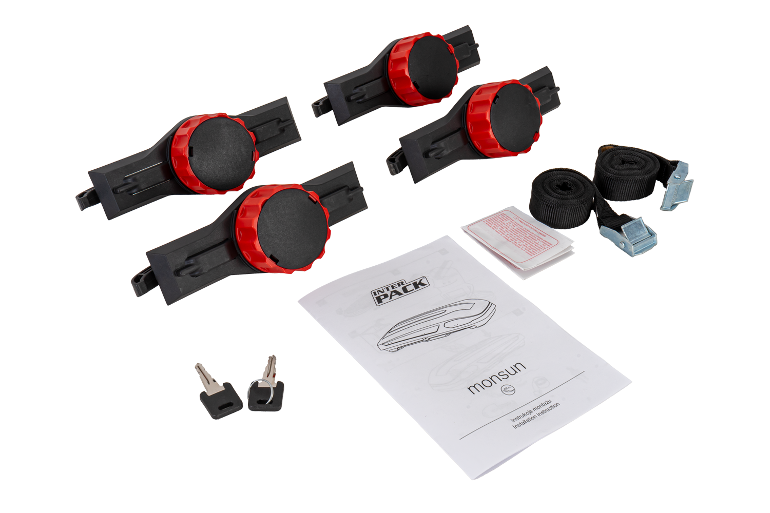 Zum Set gehören außerdem Textilgurte zur Sicherung des Gepäcks während des Transports (die Monsun-Box verfügt über spezielle Befestigungsmöglichkeiten für Gurte).