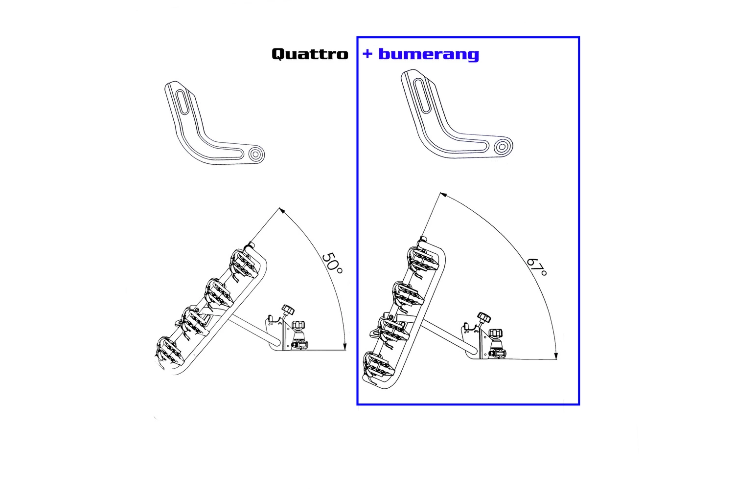 Der erweiterte Anschlag vergrößert den Neigungsbereich des Inter Pack Quattro und Trio Fahrraddecks. Mit dem „Boomerang“ können Sie den Neigungswinkel der Plattform auf 67 Grad erhöhen.