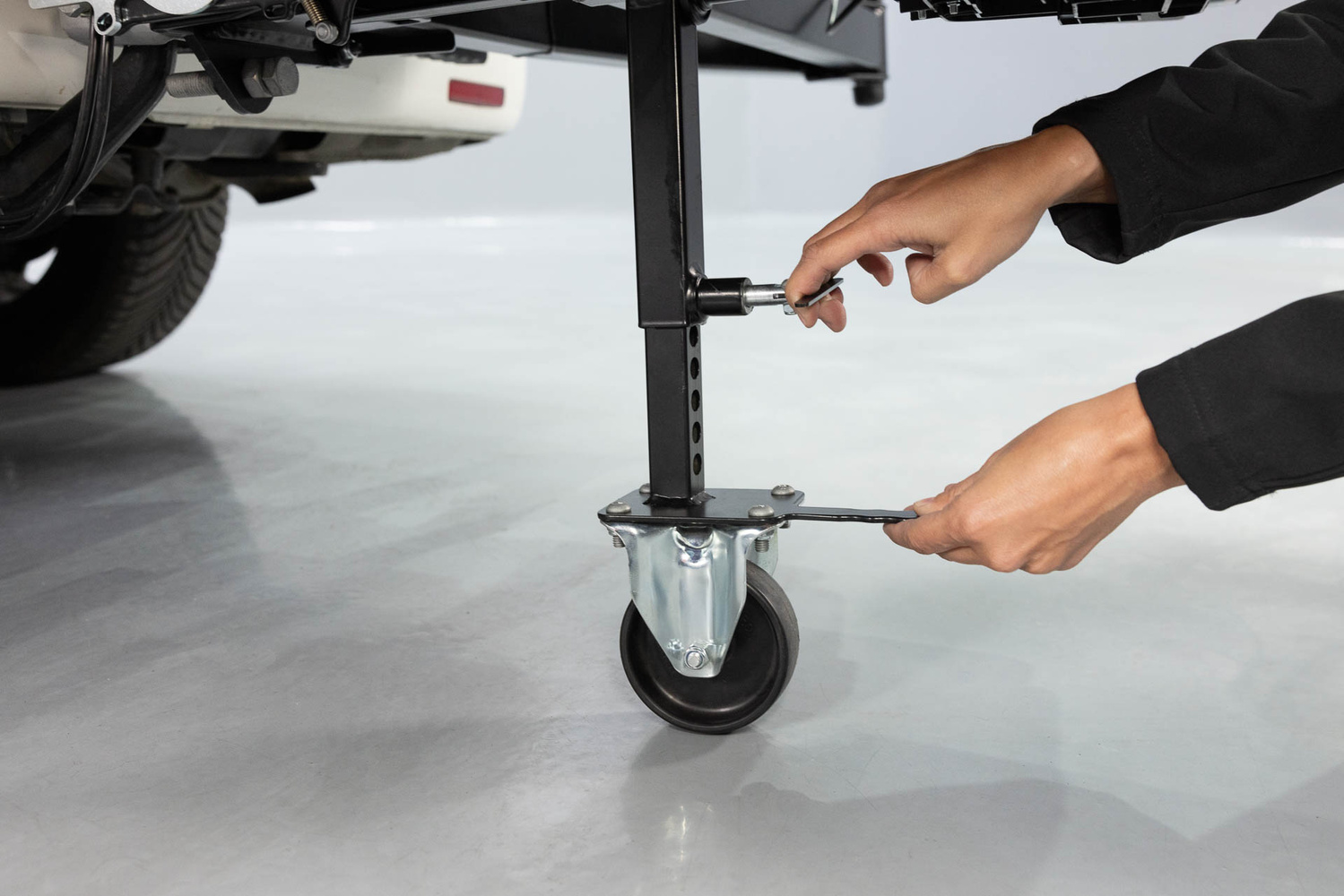Die Anhängerkupplung verfügt über ein einfaches und bequemes Hakenbefestigungssystem (mittels Handhebel), die Einziehfunktion wird mittels Fußhebel entriegelt.