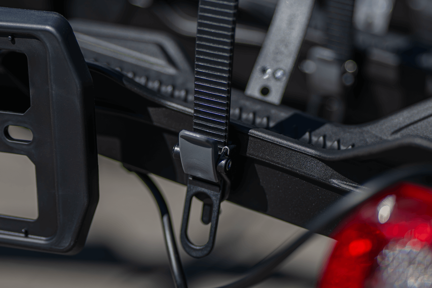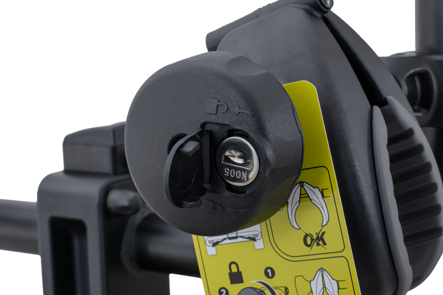 Ein Dreipunkt-Fahrradhalterungssystem sorgt für Stabilität beim Transport. Das System nutzt zwei Spanngurte – einen für jedes Rad – und einen Arm zur Stabilisierung des Fahrradrahmens. Die Kontaktpunkte sind durch eine Gummibeschichtung geschützt, die Rahmen und Räder vor Beschädigungen schützt. Jeder Arm ist mit einem Schlüsselschloss ausgestattet, um die Sicherheit Ihrer Ausrüstung beim Abstellen zu gewährleisten.