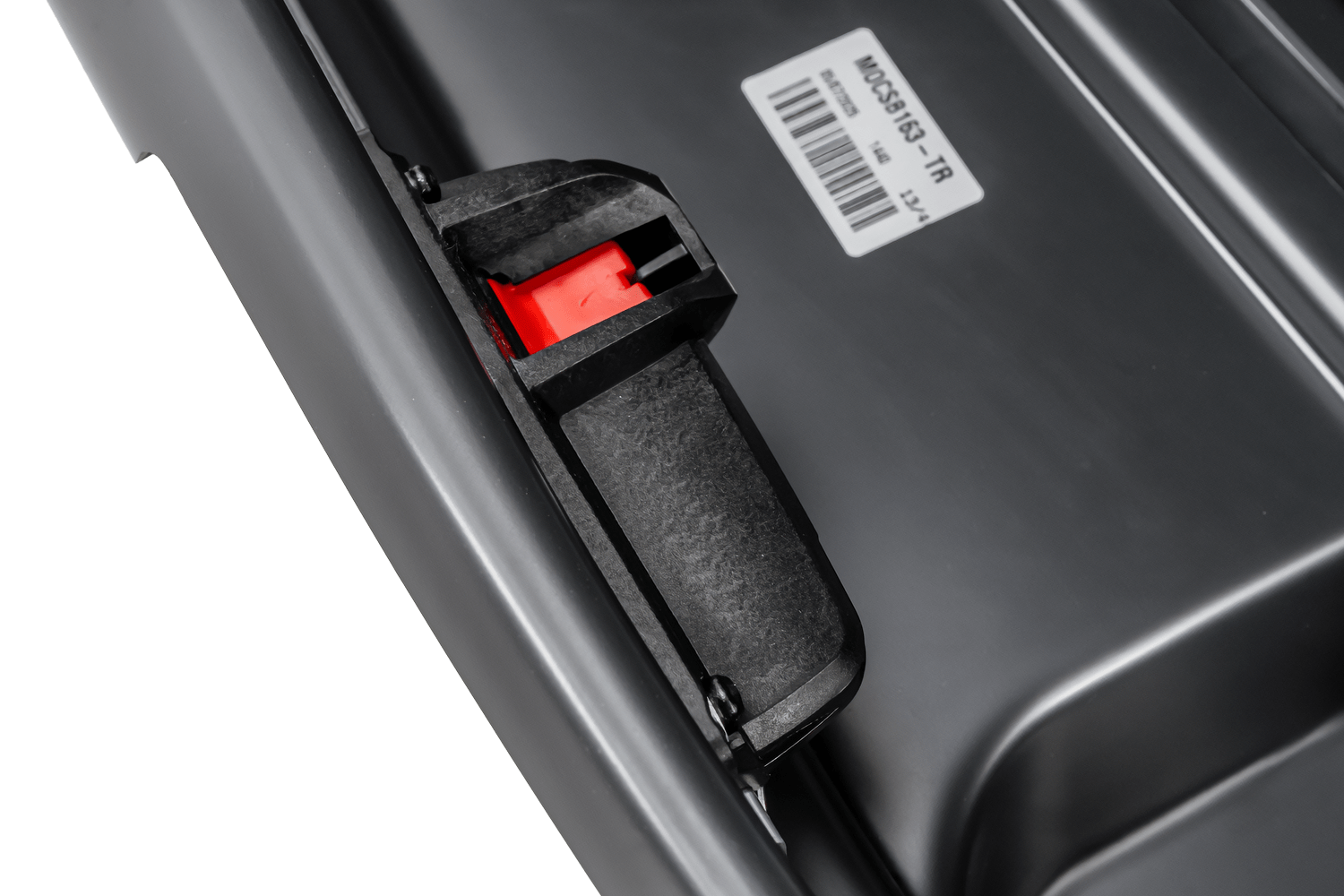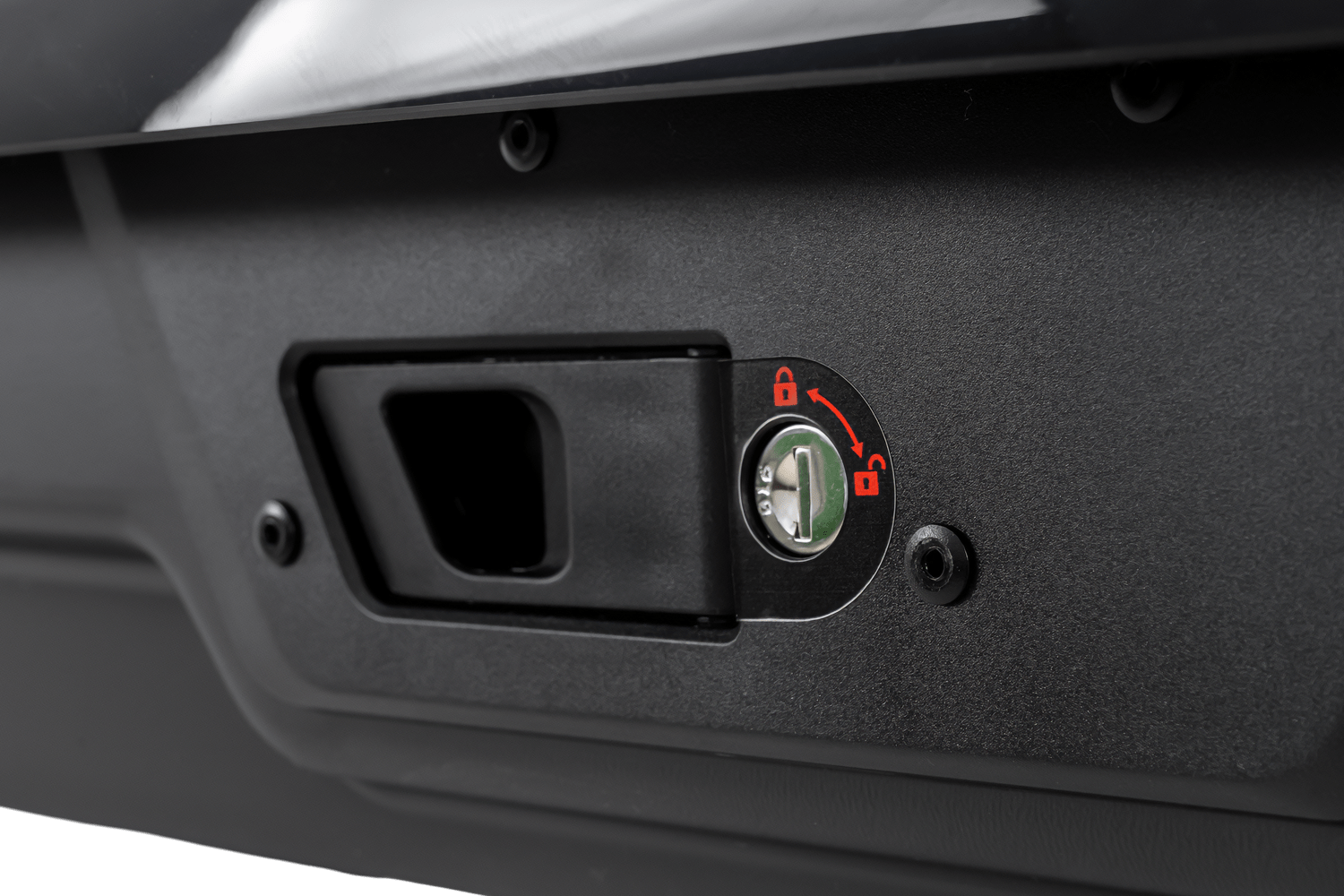 Das Zwei-Wege-Öffnungssystem ermöglicht schnellen Zugriff auf das Gepäck von allen Seiten des Fahrzeugs, während die Dreipunkt-Zentralverriegelung den Inhalt effektiv sichert. Der Schlüssel lässt sich erst abziehen, wenn die Heckklappe ordnungsgemäß geschlossen ist – das sorgt für zusätzliche Sicherheit. Der Smart Lock- Mechanismus vereinfacht die Bedienung und signalisiert das ordnungsgemäße Schließen, während automatische Verriegelungen ein versehentliches Öffnen verhindern.