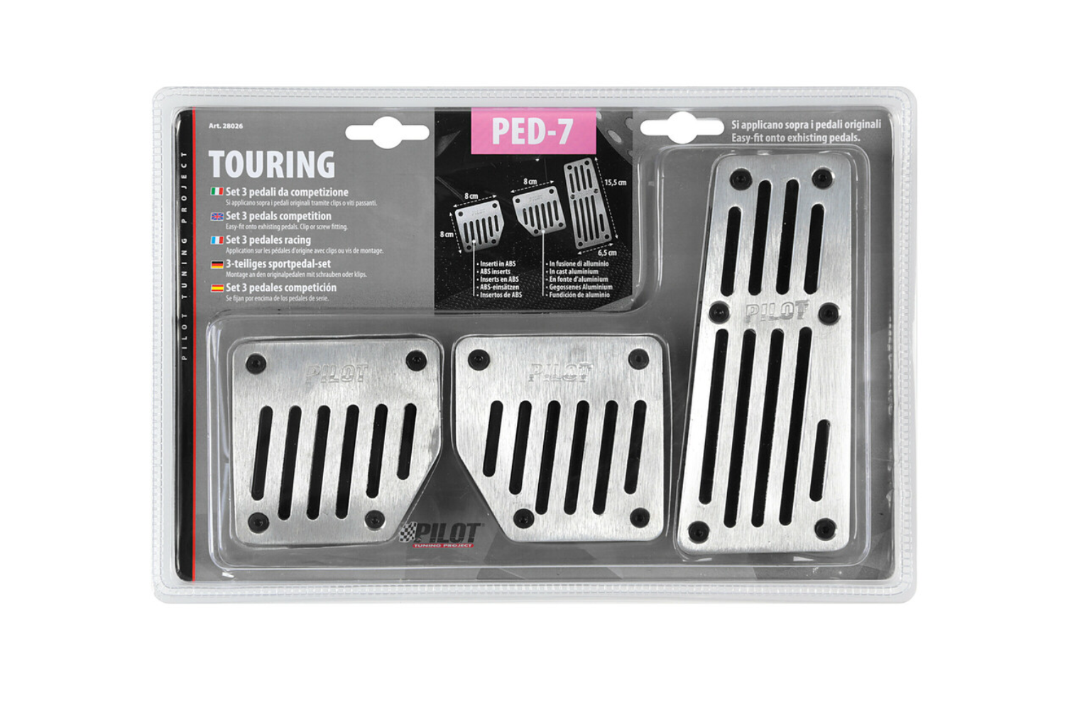 TOURING BLACK – Die Aluminium-Pedalabdeckungen von LAMPA sind eine stilvolle und praktische Möglichkeit, den Innenraum Ihres Autos aufzuwerten und den Fahrkomfort zu verbessern . Das Set beinhaltet Abdeckungen für Gas-, Brems- und Kupplungspedal , die dem Fahrzeug dank ihrer eleganten schwarzen Oberfläche einen modernen, sportlichen und komfortablen Charakter verleihen. Hergestellt aus leichtem und robustem Aluminium , gewährleisten sie Langlebigkeit und einen sicheren Halt im Alltag und auf längeren Fahrten.