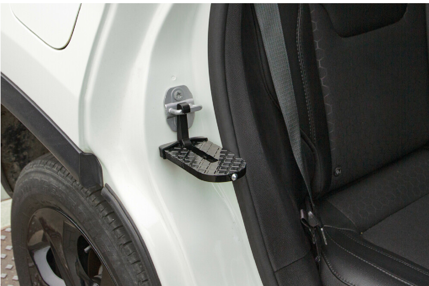 Die Montage im Türschloss ist in wenigen Augenblicken erledigt und erfordert kein Werkzeug. Nach Gebrauch lässt sich das Zubehörteil einfach im Handschuhfach oder Kofferraum verstauen. Die Trittstufe besteht aus einer Aluminiumlegierung , und eine kratzfeste Gummirückseite schützt Lack und Türsäule.