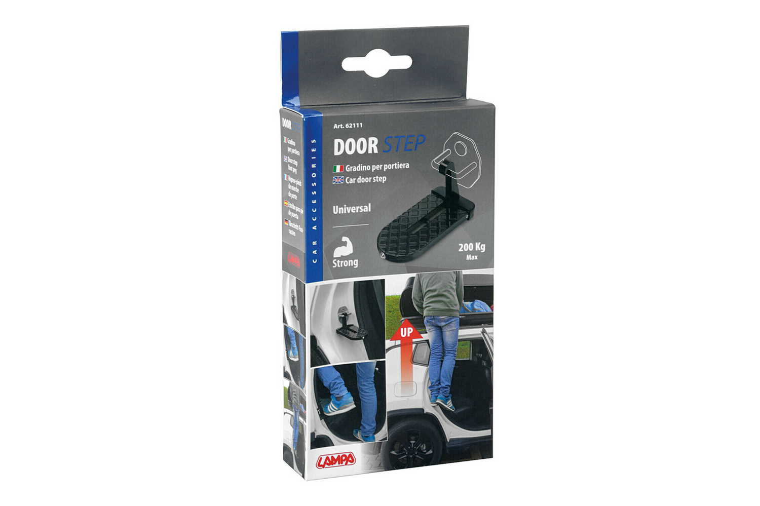 Die 2-in-1- Sicherheitstrittstufe und der Hammer von LAMPA ermöglichen einen sicheren Zugang zum Autodach ohne Leiter und dienen im Notfall auch als Scheibenbrecher . Sie werden im Türschloss befestigt und sind praktisch zum Montieren und Beladen einer Dachbox, zum Verwenden von Dachträgern sowie zum Waschen und Trocknen des Fahrzeugs – insbesondere bei höheren SUVs und Geländewagen .