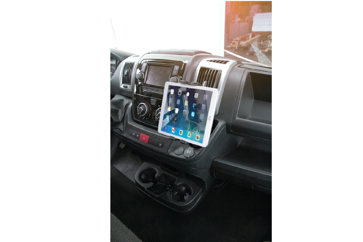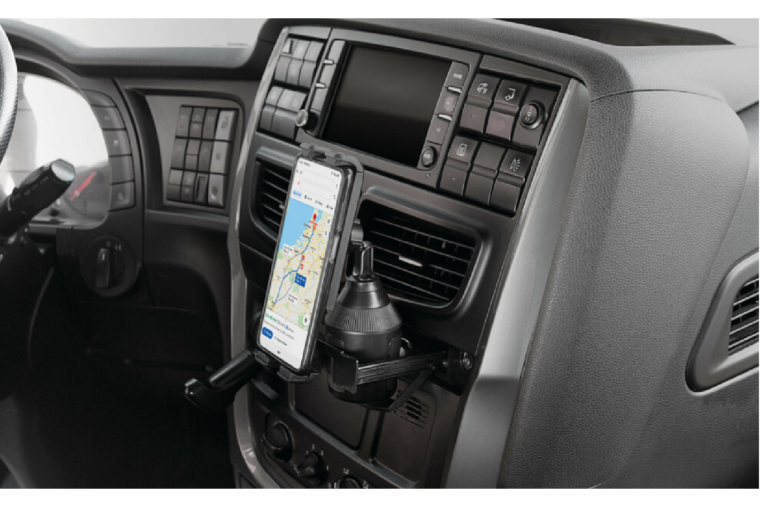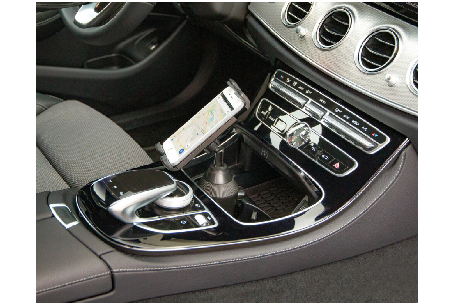 - Der Expansion Grip wird an einem 65–85 mm großen Getränkehalter befestigt und ist für Smartphones und Tablets mit einer Breite von 115–215 mm geeignet. Er verdeckt weder die Windschutzscheibe noch die Lüftungsschlitze und beeinträchtigt somit weder die Si