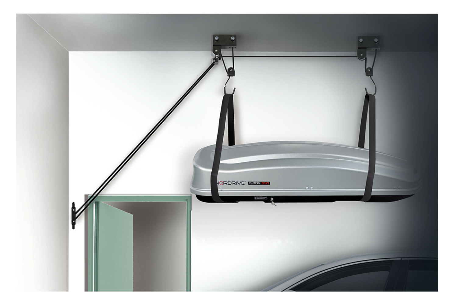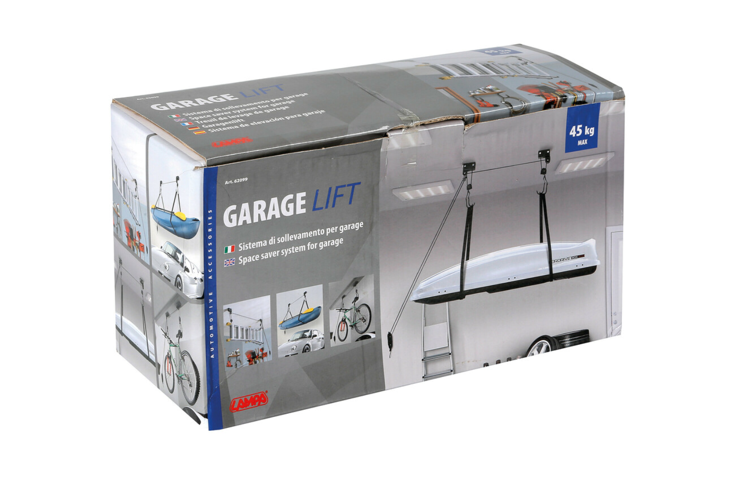 Das System eignet sich perfekt zur Aufbewahrung von Dachboxen, Kajaks, Kanus, Fahrrädern und Leitern mit einem Gewicht von bis zu 45 kg . Es sorgt für Ordnung in Ihrer Garage, schützt Ihre Ausrüstung vor Beschädigungen und ermöglicht Ihnen bei Bedarf einen einfachen Zugriff.